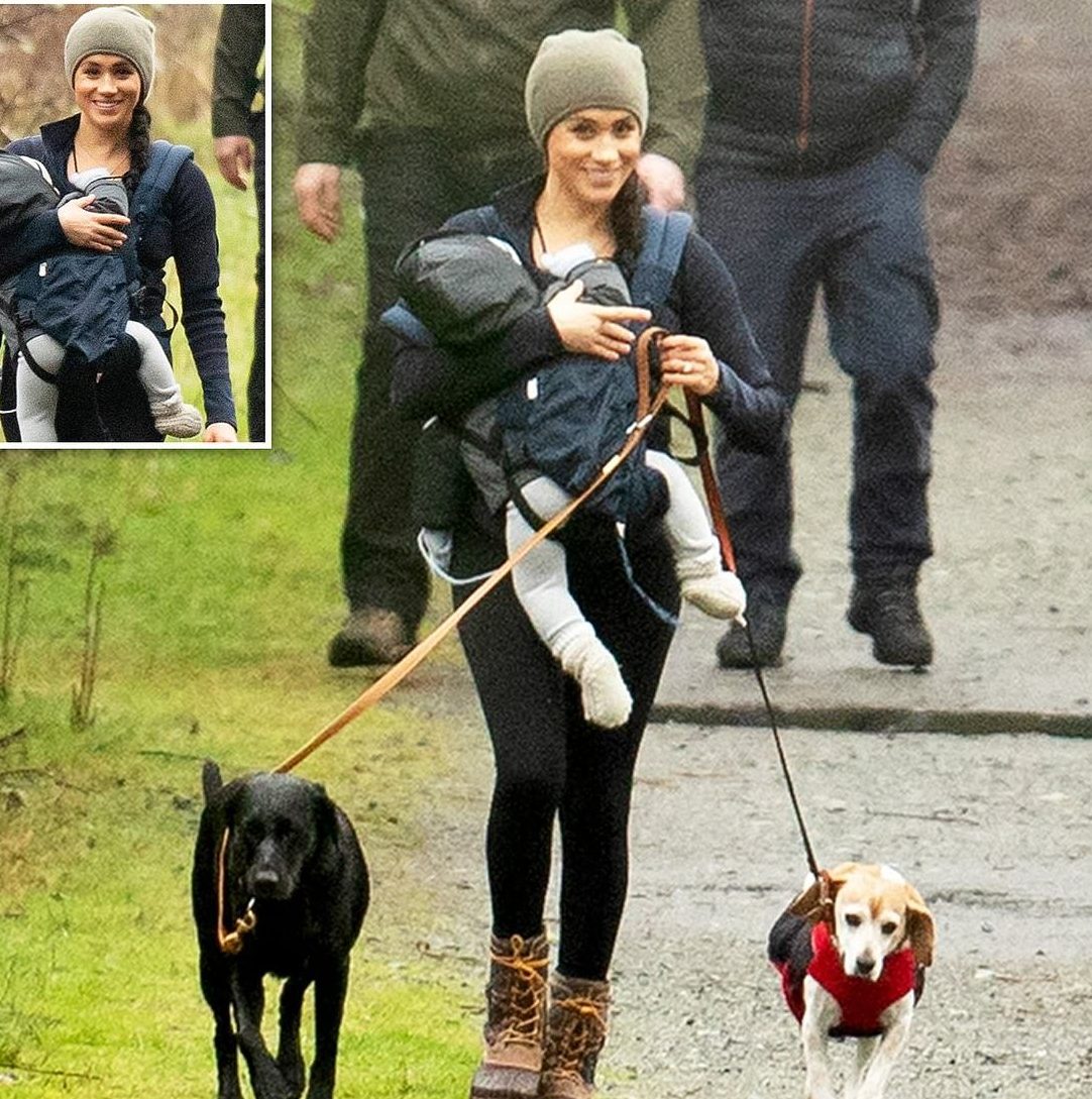 Meghan Markle – https://www.dailymail.co.uk/news/article-7909443/Meghan-beams-carrying-Archie-walking-dogs-Harry-boards-flight-Vancouver.html